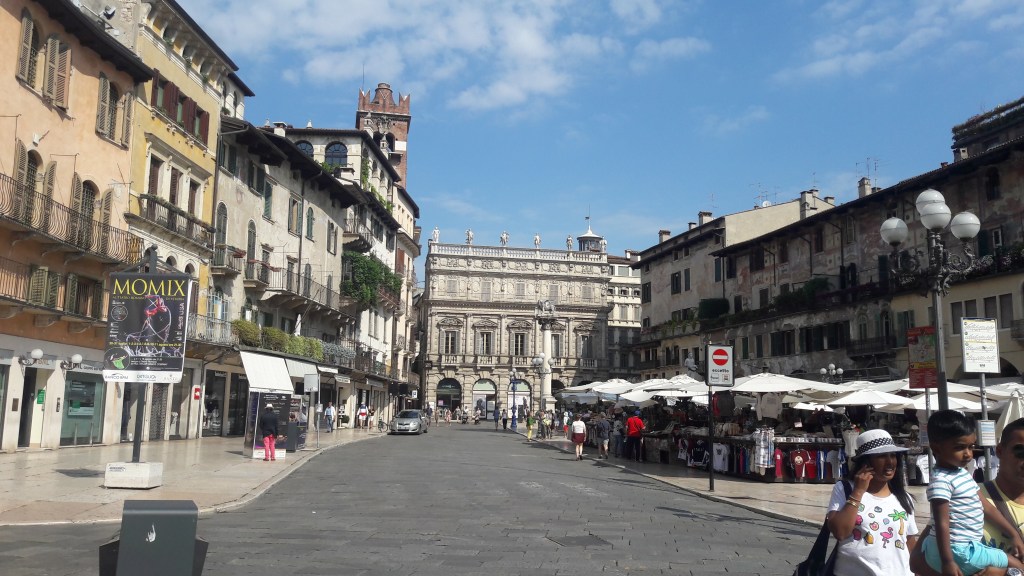 Una dei primi luoghi che ho visitato è la magnifica Piazza delle Erbe, in cui in epoca romana si svolgevano le attività economiche e sociali. In questa piazza sorge la Torre dei Lamberti, da cui si può ammirare il panorama.