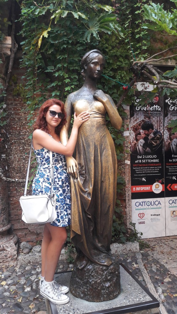 Questa sono io che tocco la statua. Infatti si dice che toccare la parte destra del petto di Giulietta porti fortuna … io ancora devo vederne gli effetti però. 🤣